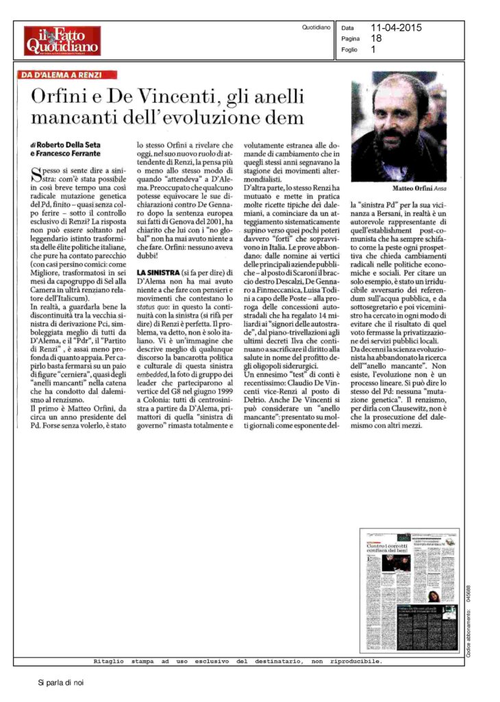 Spesso si sente dire a sinistra: com’è stata possibile in così breve tempo una così radicale “mutazione genetica” del Pd, finito – quasi senza colpo ferire – sotto il controllo esclusivo di Matteo Renzi? La risposta non può essere soltanto nel leggendario istinto trasformista delle élite politiche italiane, che pure ha contato parecchio (con casi persino comici: come Migliore, trasformatosi in sei mesi da capogruppo di Sel alla Camera in ultrà renziano relatore dell”Italicum”). In realtà, a guardarla bene la discontinuità tra la vecchia sinistra di derivazione Pci, simboleggiata meglio di tutti da D’Alema, e il “Pdr”, il “Partito di Renzi” , è assai meno profonda di quanto appaia a prima vista. Per capirlo basta fermarsi su un paio di figure “cerniera” di questo processo, quasi degli “anelli mancanti” nella catena di passaggi e trasformazioni che hanno condotto dal dalemismo al renzismo. Il primo “anello mancante” è Matteo Orfini, da circa un anno presidente del Pd. Forse senza volerlo, è stato lo stesso Orfini a rivelare che oggi, nel suo nuovo ruolo di attendente di Renzi, la pensa più o meno allo stesso modo di quando “attendeva” a D’Alema. Preoccupato che qualcuno potesse equivocare le sue dichiarazioni contro De Gennaro dopo la sentenza europea sui fatti di Genova del 2001, ha chiarito che lui con i “no global” non ha mai avuto niente a che fare. Orfini: nessuno aveva dubbi! La sinistra (si fa per dire) di D’Alema non ha mai avuto niente a che fare con pensieri e movimenti che contestano lo “status quo”: in questo la continuità con la sinistra (si rifà per dire) di Renzi è perfetta. Il problema, va detto, non è solo italiano. Vi è un’immagine che descrive meglio d qualunque discorso la bancarotta politica e culturale di questa sinistra “embedded”, è la foto di gruppo dei leader che parteciparono al vertice del G8 nel giugno 1999 a Colonia: tutti politici di centrosinistra a partire dal succitato D’Alema, primattori di quella “sinistra di governo” rimasta totalmente e volutamente estranea alle domande di cambiamento – lotta allo strapotere della finanza, diritti, ambiente, beni comuni – che in quegli stessi anni segnavano la stagione dei movimenti altermondialisti.