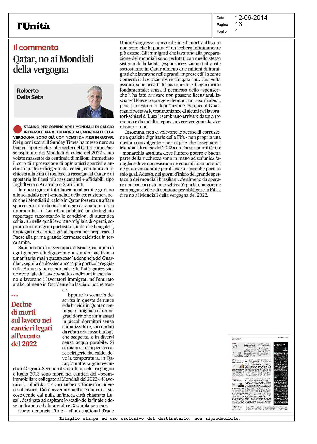 Insomma, non ci volevano le accuse di corruzione a qualche dignitario della Fifa – non proprio una novità sconvolgente… – per capire che assegnare i Mondiali di calcio del 2022 a un Paese come il Qatar – monarchia assoluta dove l’intero potere e buona parte della ricchezza sono in mano ad un’unica famiglia e dove non esistono né controlli democratici né garanzie minime per il lavoro – avrebbe portato solo guai. Adesso, nei giorni d’inizio del grande spettacolo dei Mondiali brasiliani, c’è almeno da sperare che tra corruzione e schiavitù parta una grande campagna civile e di opinione per obbligare la Fifa a dire no ai Mondiali della vergogna del 2022.