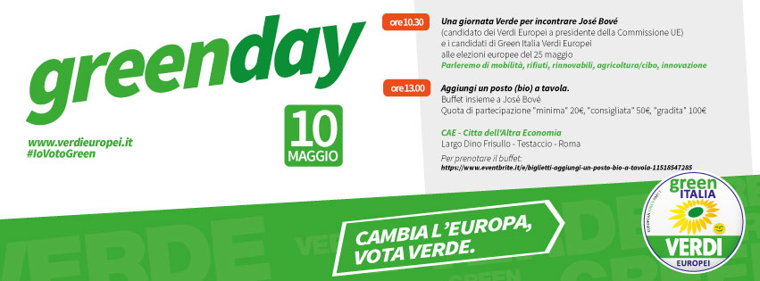 Per noi di “Green Italia Verdi Europei” sarà l’occasione per incontrarlo insieme a nostri candidati e anche per un buon pranzo all’insegna del biologico. L’appuntamento è dalle 13 alle 15 alla “Città dell’Altra Economia” (largo Dino Frisullo, Testaccio).